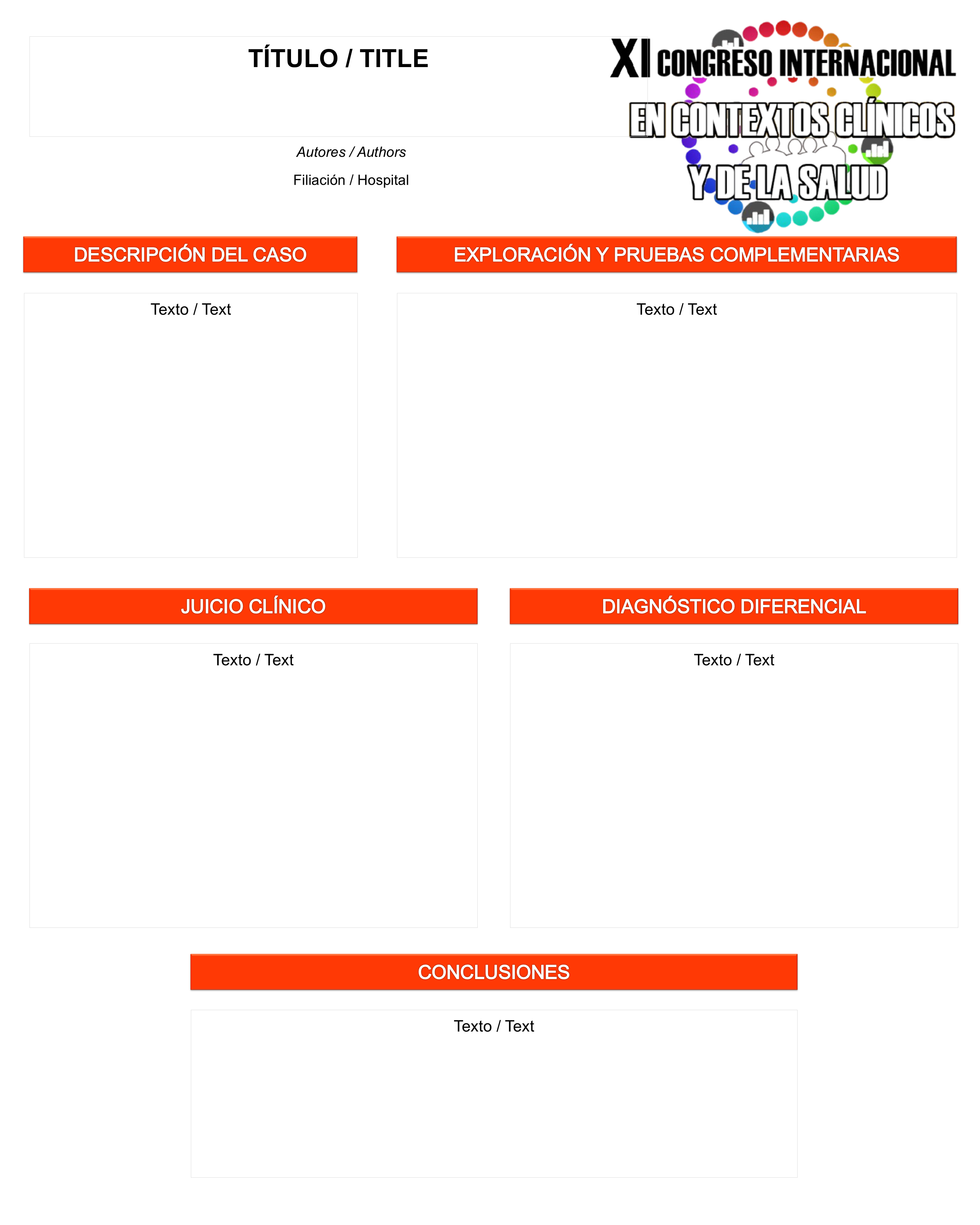 - Casos clínicos (opción disponible solo para contribuciones tipo póster/comunicación escrita). El contenido debe estar estructurado del siguiente modo: Breve descripción del caso, Exploración y pruebas complementarias, Juicio clínico, Diagnóstico diferencial, Plan de cuidados, Conclusiones.